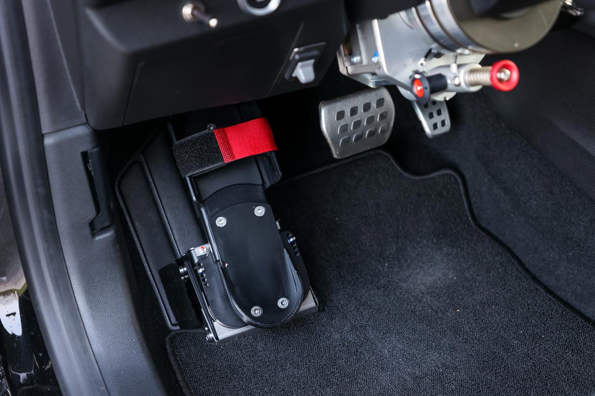 Caroline dirige son véhicule de son pied gauche grâce à un système de direction au pied et accélère et freine de son pied droit avec les pédales d’origine.