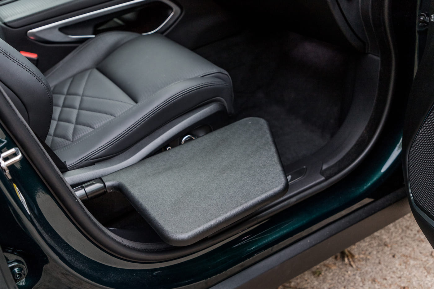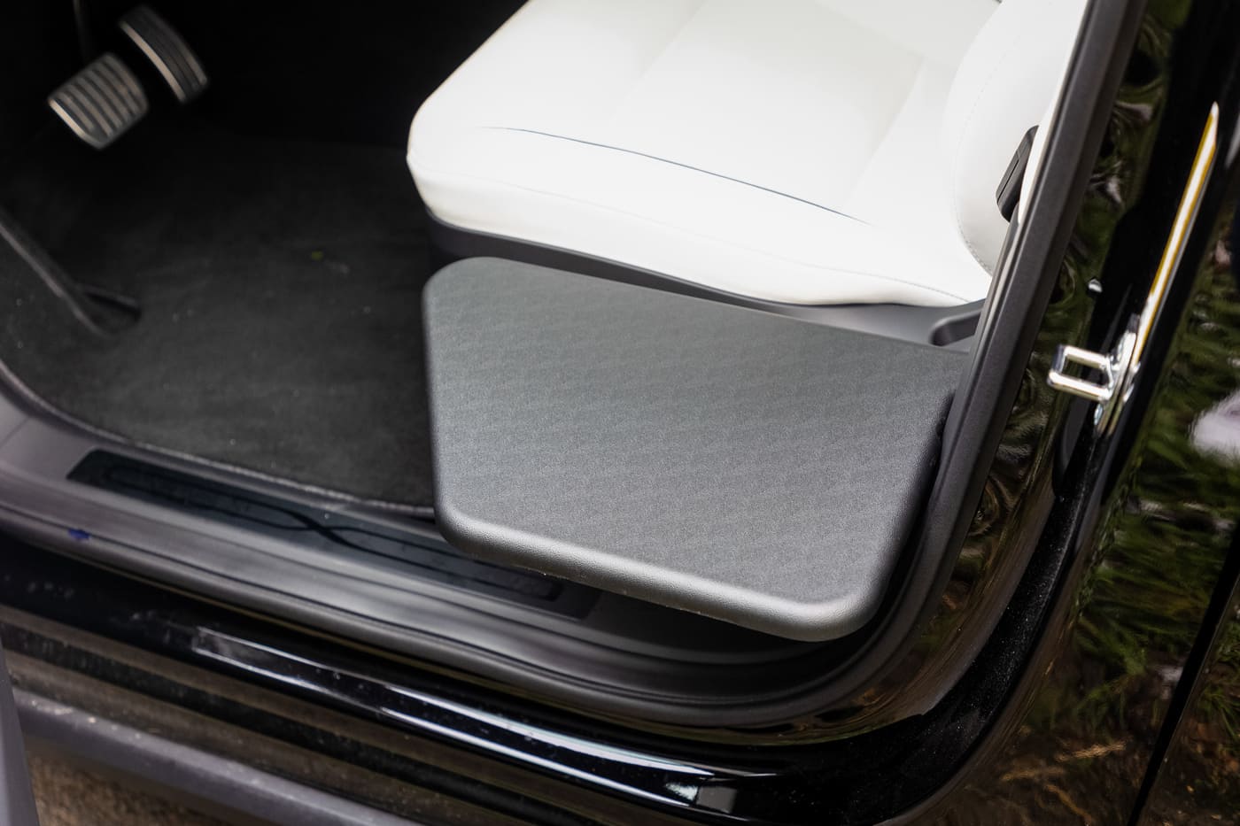 Une fois le transfert réalisé, il sait se monter très discret puisqu’il pivote de 90° pour venir se ranger contre le montant de la porte situé entre la portière avant et la portière arrière du véhicule. Et il ne gêne en rien l’utilisation de la ceinture d’origine.